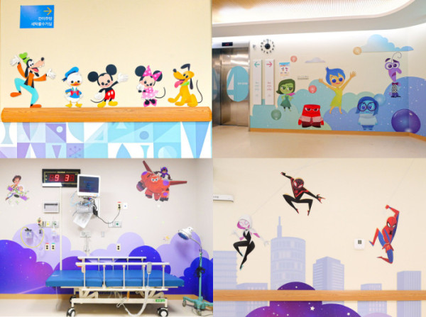 새롭게 단장된 병동에는 ‘곰돌이 푸’, ‘스파이더맨’, ‘미키와 친구들’, ‘인사이드 아웃’, ‘토이 스토리’, ‘몬스터 주식회사’, ‘릴로&스티치’, ‘빅 히어로’ 등 다양한 캐릭터의 아트워크가 설치됐다. 병동 복도와 휴게실, 관찰실 등 공간마다 색다른 테마를 입혀 아이들이 치료받는 동안 심리적 안정을 느끼고 상상력을 펼칠 수 있도록 꾸몄다. 휴게실에는 ‘곰돌이 푸’와 친구들, ‘주토피아’의 ‘닉’과 ‘주디’, ‘밤비’ 캐릭터 아트워크가 부착됐으며, 디즈니 콘텐츠를 감상할 수 있는 TV도 함께 마련됐다.