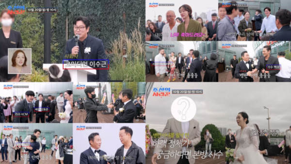 특히 결혼식 당일, 웨딩드레스를 입은 신부가 키 큰 의문의 남성을 보고 당황하는 장면이 포착돼 시선을 모았다. “어떡해...빨리 사진 찍어주세요”라며 허둥대는 신부의 모습에 스튜디오 MC들까지 놀라며 현장을 술렁이게 했다. 신부의 시선을 사로잡은 이 남자의 정체는 본 방송에서 밝혀진다.
