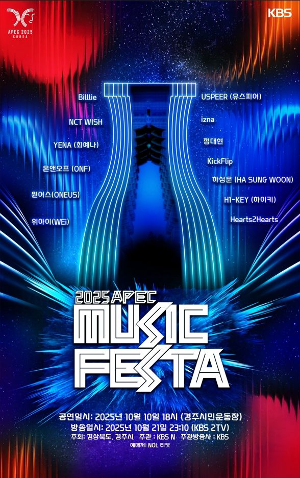 21일 APEC 뮤직 페스타 경주 공연이 KBS2에서 방송된다. 경주 APEC 뮤직페스타 라인업은 Billlie(빌리), NCT WISH(엔시티 위시), YENA(최예나), ONF(온앤오프), ONEUS(원어스), WEi(위아이)를 비롯해 USPEER(유스피어), izna(이즈나), JUNG DAE HYUN(정대현), KickFlip(킥플립), HA SUNG WOON(하성운), H1-KEY(하이키), Hearts2Hearts(하츠투하츠) 등이다. 세대와 스타일을 아우르는 이번 APEC 뮤직 페스타 라인업은 K-POP의 폭넓은 세계를 선보이는 핵심 무대가 될 것이다.