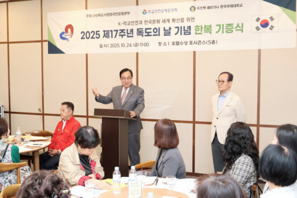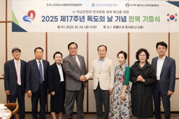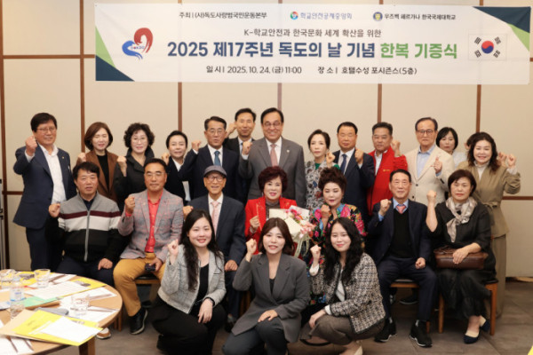 학교안전공제중앙회(이사장 정훈, 이하 공제중앙회)는 24일 오전 11시 대구 호텔수성 포시즌스에서 사단법인 독도사랑범국민운동본부(회장 원성수), 우즈베키스탄 페르가나 한국국제대학교(총장 박준호, 이하 페르가나 한국국제대)와 함께 '제17주년 독도의 날 기념 한복 기증식'을 개최했다.