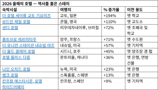 호텔스닷컴은 여행자들이 ‘과거의 건축미’와 ‘현대적 감성’을 동시에 추구하는 경향이 뚜렷해지고 있다고 분석했다. 학교, 기차역, 은행 등 역사적 건물을 리모델링한 숙소의 검색량이 급증하며, ‘휴식(Rest)’의 본질을 찾는 움직임이 확대되고 있다.