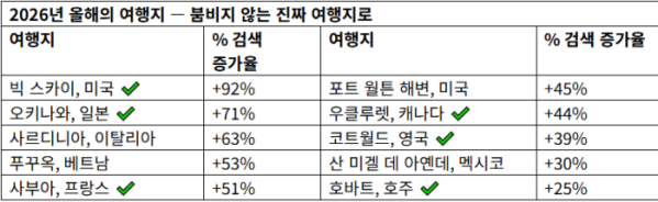 익스피디아는 ‘2026 올해의 여행지’로 세계 각지의 급부상 지역을 발표했다. 선정 기준에는 ‘Smart Travel Health Check’라는 지속가능 여행 평가 모델이 적용됐다. 익스피디아 그룹 CEO 아리안 고린(Ariane Gorin)은 “여행의 진정한 가치는 지역 문화에 몰입하고, 현지 경제를 지원하는 데 있다”며 “익스피디아는 여행을 통한 긍정적 변화를 이끄는 촉매제 역할을 할 것”이라고 밝혔다.