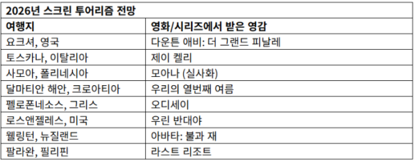 ‘스크린 투어리즘’은 영화나 드라마 속 배경지를 실제 여행지로 선택하는 트렌드로, 현재 미국에서만 80억 달러 규모의 잠재 산업으로 성장하고 있다. 전 세계 여행자의 53%가 스크린 여행에 관심을 보였으며, Z세대·밀레니얼 세대의 81%가 콘텐츠를 기반으로 여행을 계획하고 있다.