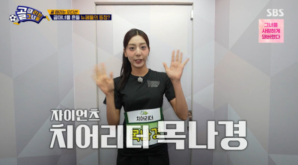 먼저 롯데 자이언츠의 치어리더 목나경이 등장해 골 세리머니를 예고해 눈길을 끌었다.