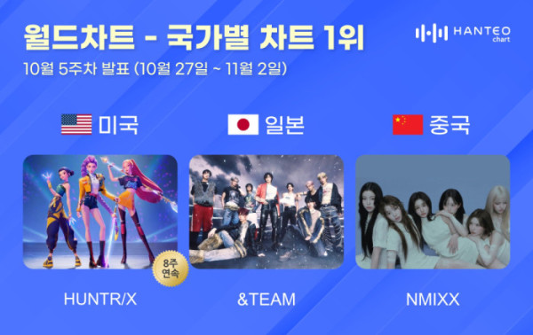 세계 유일의 실시간 음악차트인 한터차트는 7일 오전, 10월 5주 차(집계 기간 10월 27일~11월 2일) 미국, 일본, 중국 국가별 차트 TOP 30을 발표했다. 이에 따르면 헌트릭스와 앤팀 그리고 엔믹스가 1위에 이름을 올렸다.
