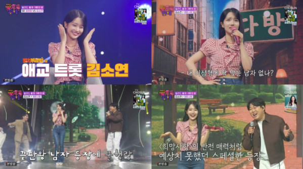 이어진 무대에서 김소연은 “어디 내 이상형에 딱 맞는 남자 없나?라고 내레이션을 펼쳤고, 김희재와 나상도가 후보로 등장해 자신을 어필하며 뮤지컬 무대 같은 오프닝을 열었다. 그러자 김소연은 “둘 다 아니야. 어디 청바지가 잘 어울리는 남자 없나?”라며 노래를 시작해 신선한 매력을 전했다.