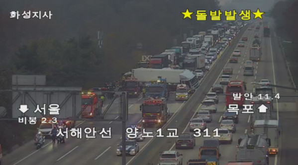 한국도로공사는 이날 안전안내문자를 통해 “화물차 추돌사고로 서울방향 차도를 모두 차단한다”라면서 “39번 국도를 우회 이용해달라”고 전했다.