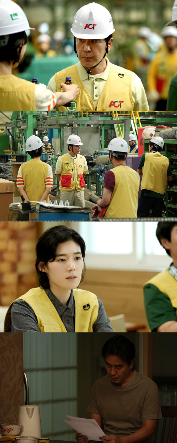 이런 가운데 공개된 사진 속 공장 직원들은 안전모부터 작업복까지 완벽하게 갖춰 입었음은 물론 김낙수에게 음료를 건네는 호의를 보이고 있다. 반면 공장의 모든 구조를 파악하고 잇는 작업반장 이주영(정은채 분)은 갑작스러운 김낙수의 변화를 심각하게 주시하며 직원들의 동태를 살피고 있다.