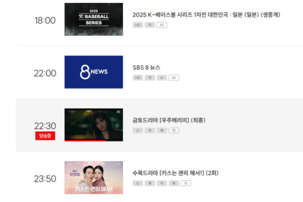 SBS 8 뉴스가 오후 10시에 방송됐고 이어 오후 10시 30분부터 '우주메리미' 최종회가 방송 중이다. 그리고 오후 11시 50분부터는 수목드라마 '키스는 괜히 해서' 2회가 재방송 된다.