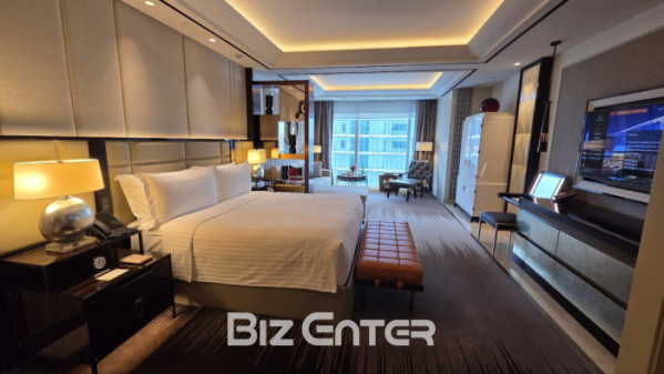문을 열고 들어간 디럭스룸은 기본 등급이라는 사실이 무색했다. 43㎡의 넉넉한 면적, 욕조와 샤워부스를 분리한 구성, 포근한 침구까지 모두 스위트룸에 가까운 수준이었다.