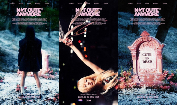 17일 하이브 레이블즈 유튜브 채널에는 아일릿의 싱글 1집 'NOT CUTE ANYMORE'와 동명의 타이틀곡 뮤직비디오 무빙 포스터가 공개됐다. 눈 내리는 정적 속 뒷모습만 드러난 인물이 등장하는 첫 영상은 불안한 긴장감을 남겼고, 두 번째 영상에서는 탈색 헤어와 시크한 표정의 모카가 총성을 울리며 분위기를 단번에 전환했다. 마지막 영상에서는 'CUTE IS DEAD' 문구가 새겨진 핑크색 묘비가 등장해 콘셉트의 방향성을 암시하며 화제를 모았다.