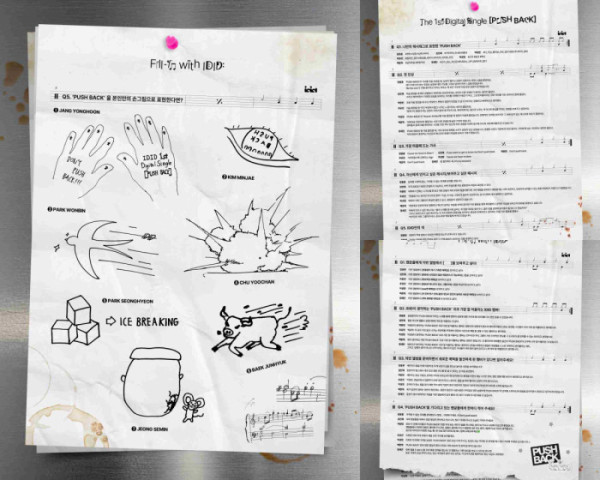 ‘아이스 브레이킹’의 제목인 ‘Fill in with IDID‘의 ’Fill in’은 ’채우다‘라는 의미와 함께 드럼 용어이자 단조로운 리듬 사이에 변화를 주어 곡을 더 생생하게 만드는 연주자의 개성을 드러내는 장치라는 중의적 표현으로, 아이딧(IDID)이 이번 앨범을 통해 표현하고자 하는 음악적인 영감을 가득 채워 넣었다. 이 밖에 나만의 해시태그와 손 그림으로 표현한 ‘PUSH BACK’은 아이딧(IDID) 멤버들의 개성과 취향을 그대로 드러내 미소를 유발한다. 물고기를 찾는 전단지 느낌의 트랙리스트와 결이 닮은 종이에 연필과 펜으로 거침없이 채운 그림과 악보 또한 ‘하이엔드 청량돌’에서 ‘하이엔드 러프돌’로 진화 중인 그룹의 색다른 변신을 기대케 하고 있다.