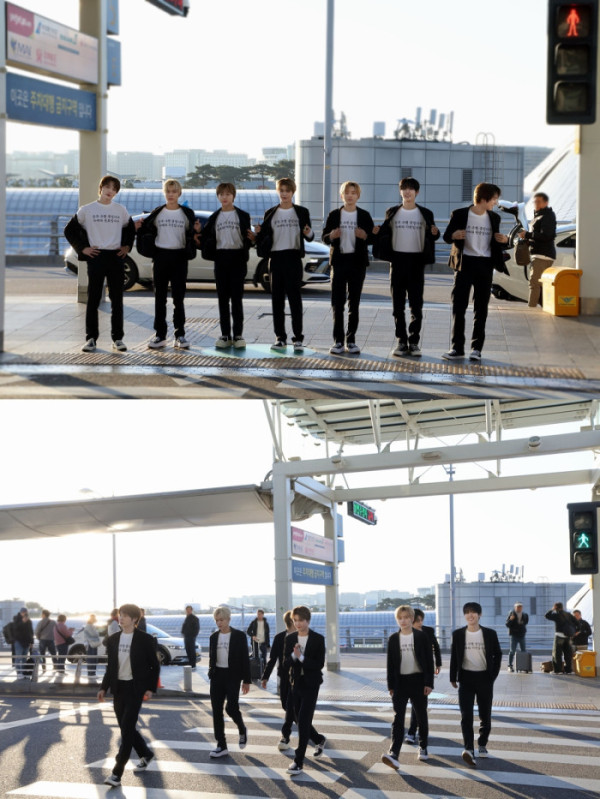 이날 멤버들은 '소년 에이전트' 콘셉트를 공항 패션에 자연스럽게 녹여냈다. 블랙 수트와 화이트 티셔츠를 조합한 패션은 마치 임무를 수행하러 이동하는 요원들의 드레스코드를 연상시키며 시선을 사로잡았다. 특히 하얀색 티에 새겨진 '공무 수행 중입니다. 누에라입니다'라는 위트 있는 문구는 보는 이들에게 웃음을 선사했다.