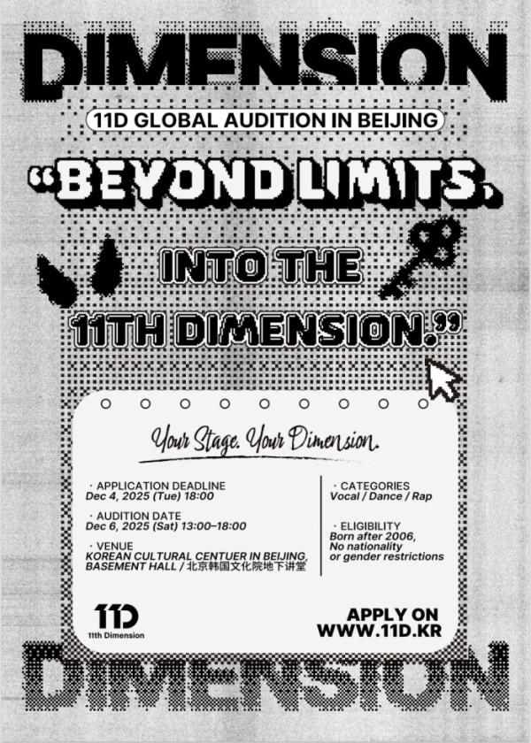11D에서 진행하는 ‘11D GLOBAL AUDITION IN BEIJING’은 보컬, 댄스, 랩 분야를 모집하며, 2006년 이후 출생자라면 국적과 성별에 관계없이 누구나 지원할 수 있다. 신청은 12월 4일 오후 6시까지 11D 공식 홈페이지에서 가능하며 오는 12월 6일 오후 1시부터 6시까지 중국 베이징에 위치한 주중한국문화원에서 치러진다.