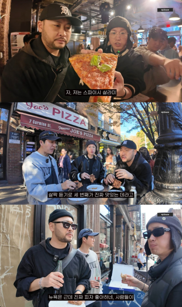 영상에서 에픽하이는 일정 차 방문한 미국 뉴욕에서 현지 친구들에게 추천받은 피자 맛집을 직접 찾아가 맛보고 평가하는 ‘피자 도장 깨기’를 진행했다.
