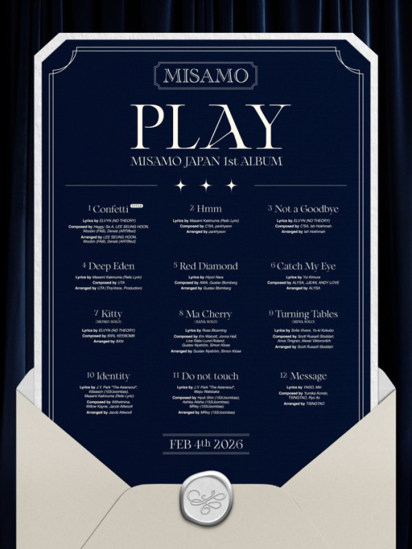 미사모는 내년 2월 4일 출시될 정규 1집 'PLAY'에 타이틀곡 'Confetti'를 포함해 총 12곡을 담았다. 트랙리스트에는 'Hmm', 'Not a Goodbye', 'Deep Eden', 'Red Diamond', 'Catch My Eye', 모모의 솔로곡 'Kitty', 사나의 'Ma Cherry', 미나의 'Turning Tables', 미니 2집 타이틀곡 'Identity', 데뷔곡 'Do not touch', 'Message' 등이 이름을 올렸다. 특히 돔 투어 'MISAMO JAPAN DOME TOUR 2024 "HAUTE COUTURE"'에서 첫 공개된 'Catch My Eye'와 'Red Diamond'가 정식 수록돼 팬들의 반가움을 더했다.