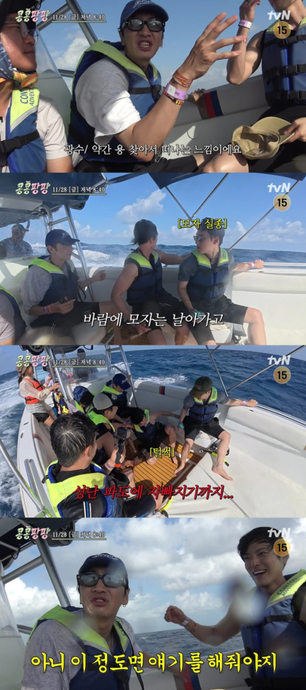 '콩콩팡팡' 출연진들은 고래상어를 만나기 위해 배를 타고 먼 바다로 나서지만, 출발과 동시에 거센 파도에 휘말리며 긴장감을 드러낸다. 파도가 배 안으로 들이쳐 짐 가방이 젖었고, 체격 좋은 김우빈조차 좌석을 버티지 못할 정도의 충격이 이어지며 고난의 항해가 펼쳐진다.