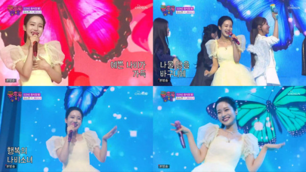 김소연은 무대 전부터 상큼한 비주얼로 시선을 사로잡았다. 노란색 원피스를 입고 요정 같은 비주얼로 무대에 오른 김소연은 특유의 화사한 미소와 살랑거리는 춤선을 더해 ‘나비소녀’ 무대를 극대화했다.