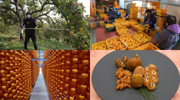 껍질을 벗기는 건 기계로 하기도 하지만 잘 벗겨지지 않는 부분은 작업자들이 직접 박피를 할 수밖에 없어 손이 많이 간다. 또 껍질을 벗겨낸 감은 곰팡이가 피는 것을 막기 위해 바람이 잘 통하는 거대한 건조장에 하나하나 매달아서 60일가량 잘 말려야지 비로소 곶감으로 탄생할 수 있다. 그만큼 시간과 정성이 많이 들어가는 음식이다. 마무리로 무게에 따라 선별한 후에 하나하나 포장 과정을 거쳐 소비자들에게 전달된다.