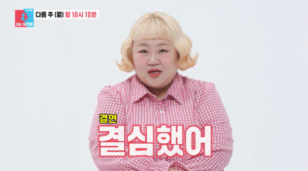 이날 '동상이몽2' 예고에서 홍윤화는 "중대 발표를 하겠다"라며 "제 인생의 마지막 다이어트를 결심했다"라고 밝혔다.