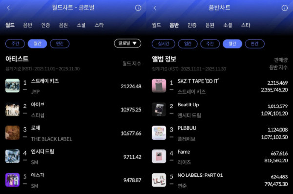 세계 유일의 실시간 음악차트인 한터차트는 1일 오전 10시, 2025년 11월 월간차트를 발표했다. 이에 따르면 스트레이 키즈가 한터차트 11월 월간차트에서 2관왕을 차지했다.