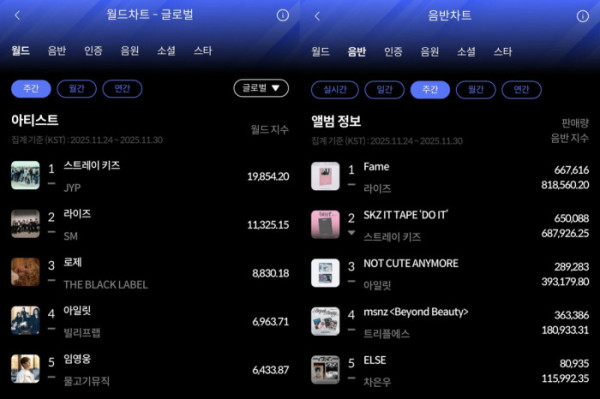 한터차트는 지난 1일 오전 10시, 2025년 11월 5주 차 주간차트를 발표했다. 이에 따르면 스트레이 키즈와 라이즈가 한터차트 11월 5주 차 월드차트와 음반차트 각 부문 1위를 차지했다.