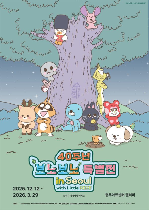 라이즈가 직접 그린 캐릭터 'WE LITTLE RIIZE'(리라즈) 역시 일본 인기 캐릭터 보노보노와 손잡았다. 12일 서울 충무아트센터 갤러리에서 개막하는 '보노보노 40주년 특별전'에 리라즈가 등장하는 것으로 알려졌으며, 이는 '보노보노/원작: 이가라시 미키오'와 K팝 아티스트의 첫 협업이라는 점에서 주목된다. 리라즈 여섯 캐릭터(리즈코, 송용돌이, 우락밤, 토냥덕, 똘병, 멍룡이)는 보노보노 캐릭터들과 1:1 매칭돼, 각자의 특징을 반영한 새로운 디자인과 오리지널 대사 연출을 통해 색다른 관람 포인트를 제공한다.