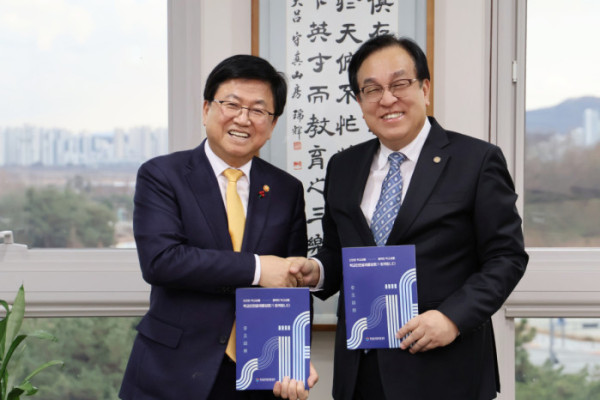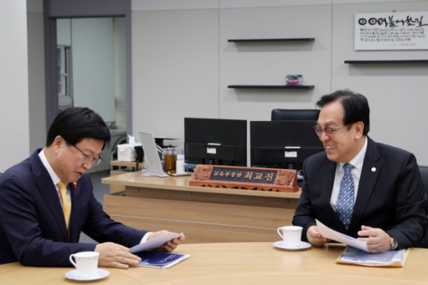 ▲최교진 교육부장관(왼쪽), 정훈 학교안전공제중앙회 이사장(사진제공=학교안전공제중앙회 )