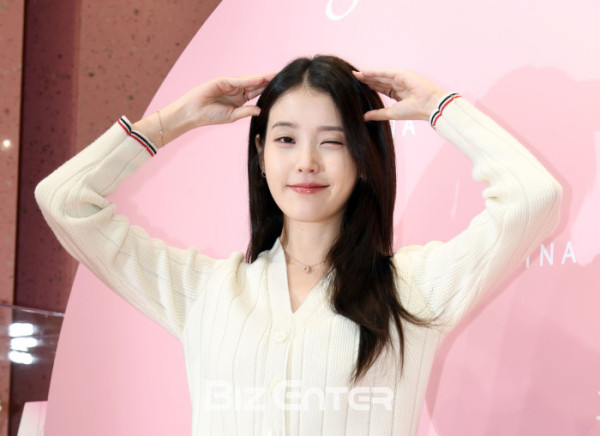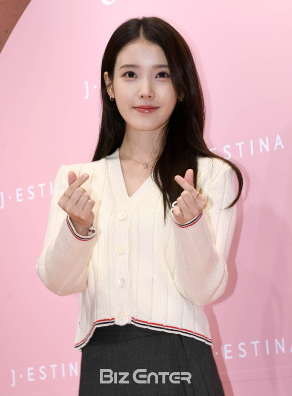 아이유가 26일 서울 잠실 롯데백화점에서 열린 브랜드 제이에스티나(J.ESTINA) 팝업스토어 오픈행사 참석해 포즈를 취하고 있다.