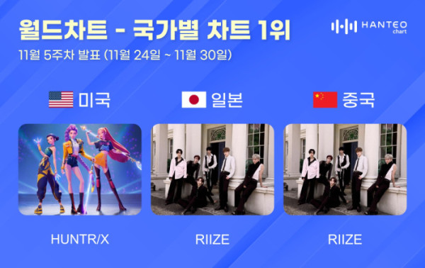 한터차트는 5일 오전, 11월 5주 차(집계 기간 11월 24일~11월 30일) 미국, 일본, 중국 국가별 차트 TOP 30을 발표했다. 이에 따르면 헌트릭스와 라이즈가 각 부문 1위에 등극했다.