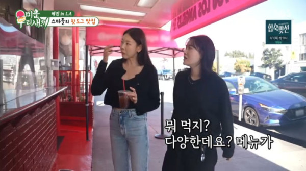 '미우새' 한혜진이 핑크 외관의 LA 핫도그 맛집을 방문했다.