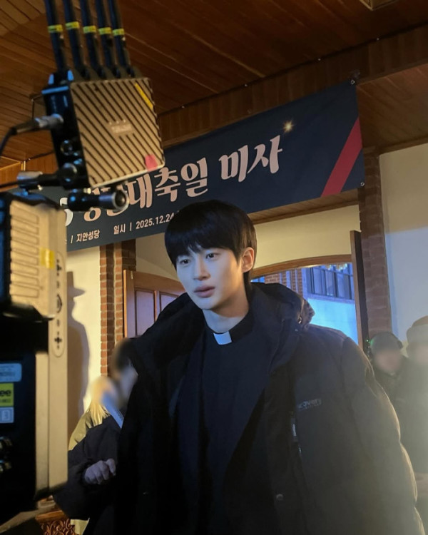 사진 속 변우석은 검은색 사제복을 완벽하게 소화하며 '빈첸시오' 신부로 변신한 모습이다. 190cm의 우월한 기럭지로 완성한 사제복 핏은 보는 이들의 감탄을 자아낸다. 특히 성당 문 뒤에서 장난기 넘치는 미소를 짓거나, 강아지를 품에 안고 꿀 떨어지는 눈빛을 보내는 등 '멍뭉미' 넘치는 매력을 발산하며 팬들의 마음을 설레게 했다.