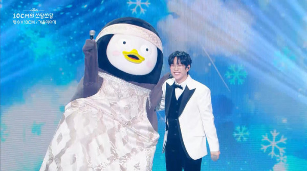 이어 ‘더 시즌즈’ 최연소 게스트 펭수가 파티에 참석했다. 화려한 머리띠와 드레스, 하이힐로 ‘위대한 센치비 파티’의 드레스 코드를 맞춘 펭수는 210cm의 존재감으로 시선을 사로잡았고, 즉석에서 십센치의 ‘봄이 좋냐??’를 펭수 버전으로 불렀다. 이어 펭수는 “클래식에는 쇼팽, 가요계에는 십펭이 있다”며 십센치와 캔의 ‘겨울이야기’ 무대를 선보였다.