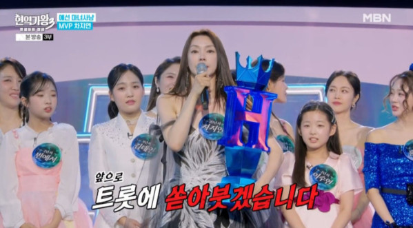 30일 '현역가왕3'에서는 예선전 '마녀사냥' 무대와 함께 본선 진출자가 가려졌다. 지난 방송에서 '올인정'을 받은 뮤지컬 배우 차지연이 예선 MVP를 받았고, 그는 "20년 동안 뮤지컬에서 갈고 닦은 것을 트로트에 쏟아붓겠다"라며 "누가 되지 않도록 사력을 다하겠다"라고 각오를 밝혔다.