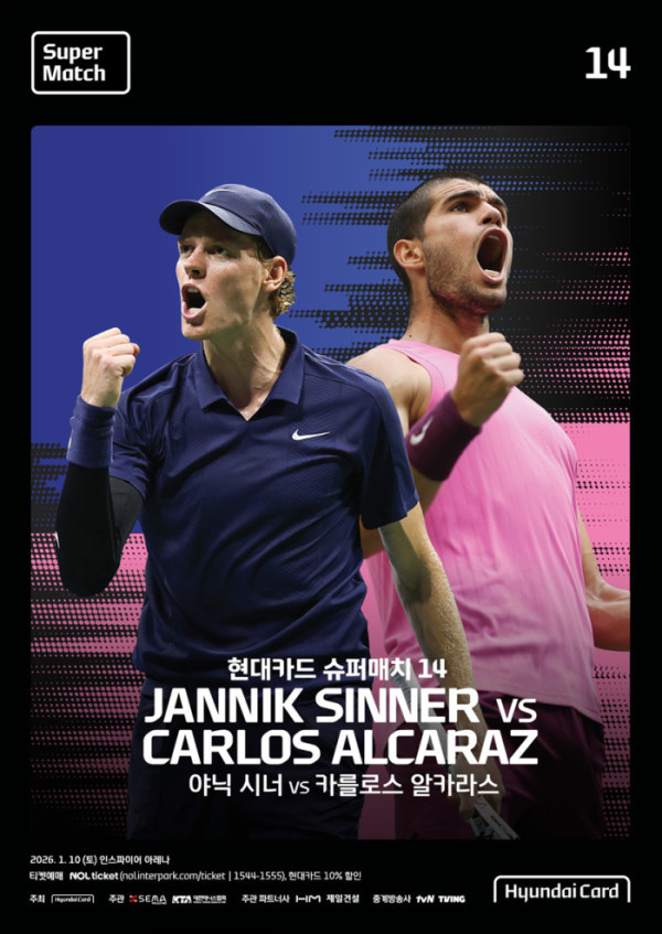 ‘현대카드 슈퍼매치 14’에서는 현재 ATP 단식 랭킹 1~2위를 달리고 있는 카를로스 알카라스와 야닉 시너의 단독 라이벌 매치가 펼쳐진다.