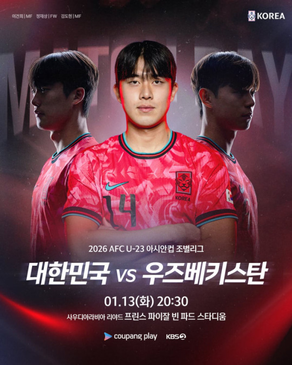 대한민국은 13일 오후 8시 30분(한국시간) 프린스 파이잘 빈 파드 스타디움에서 우즈베키스탄의 AFC U-23 아시안컵 조별리그 최종전을 치른다. 이날 경기는 KBS2와 쿠팡플레이에서 중계한다.