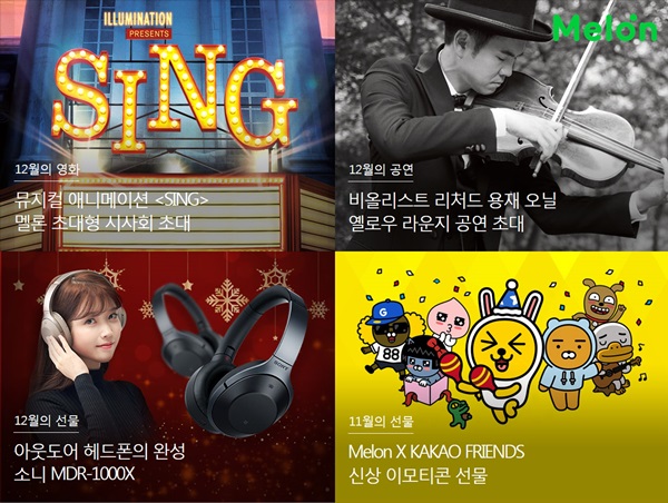 1일 로엔에 따르면 멜론은 오는 11일까지 뮤지컬 애니메이션 '씽(SING)' 시사회 350명, 비올리스트 리처드 용재 오닐 '옐로우 라운지(Yellow Lounge)' 공연 250명을 대상으로 이벤트를 진행한다. 또 멜론 VIP 위크에는 대림미술관 ‘닉 나이트 사진展’의 초대 이벤트를 진행한다.