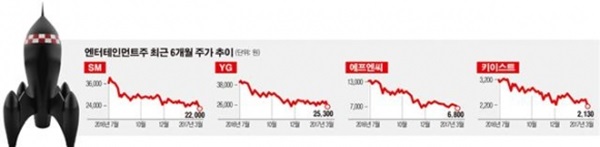 일차적으로는 사드 리스크가 엔터 상장사 실적에 직접 영향을 미친 것이라는 분석이 우세하다. 그러나 증시 전문가 상당수는 향후 모멘텀의 문제라고 입을 모았다. 에스엠, 와이지엔터의 경우 중국 매출 비중이 20%에 불과하다는 것. 또 YG PLUS는 4월 설립을 추진했던 코스메틱 브랜드 ‘문샷’의 현지 론칭이 무산된 것도 영향을 준 사례로 지목했다.